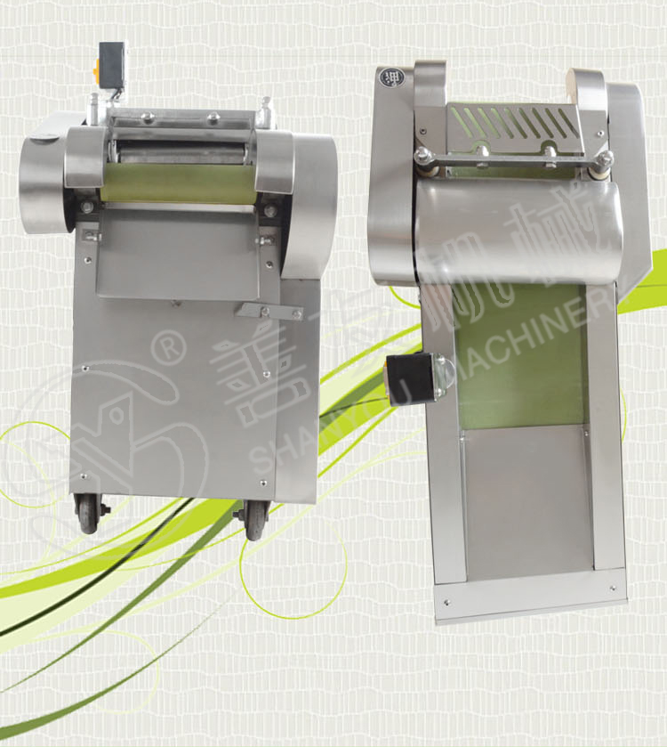 多用切菜机工作原理: 主要由机架,输送带,压菜带,切片机构,调速箱或塔轮调速机组成,用于瓜薯类硬菜的切片,片厚可在一定范围内自由调节,竖刀部分可将叶类软菜或切好的片加工成不同规格的块,丁,菱形等各种形状。切菜长度通过“可调偏心轮”在一定范围内任意调整。因竖刀模拟手工切菜原理,加工表面平整光滑,成型规则,被切蔬菜组织完好,保持新鲜。