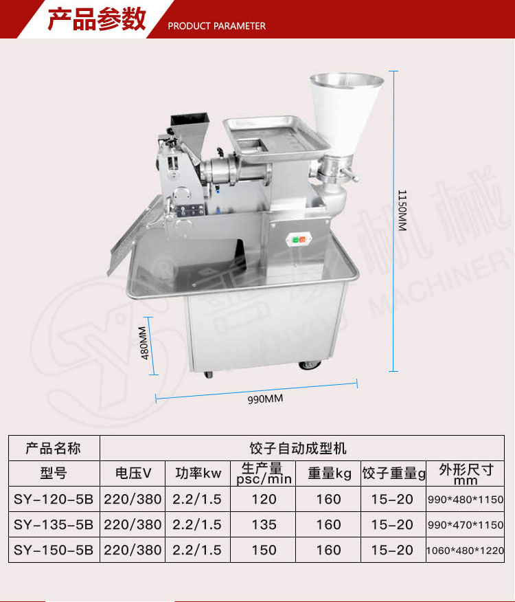 2. 面皮厚度与馅量可调整。 3. 适合多种调理: 包制出来的饺子可蒸、煮、炸、煎。春卷与咖喱角与咖喱卜油炸尤其可口。最重要的是均适合急速冷冻、耐贮藏,是理想的微波炉食品。 4. 操作简便省时省力: 人工制造饺子、春卷、锅贴、咖喱卜、咖喱角,耗时费工,尤其目前在劳工严重缺乏的情形下,更是令大多数的老板烦恼不已,这台机械操作简便,无经验者也可操作。制造速度快,不但省时而且省力。 5. 完美的设计,同时兼顾卫生与美观两大优点。 6. 拆装容易、清洗简便。 7. 结构精巧占地小: 机械尺寸: 990(长)×470(宽)×1150(高)毫米。重量:150公斤。 8. 产量高: 饺子:3,000-6,000个/时 春卷:1,500-3,000个/时 锅贴:2,000-4,000个/时 咖喱饺:2,000-5,000个/时 SY-JZJ系列饺子自动成型机,本机适用于宾馆、饭店、餐厅、团体食堂加工、幼儿园、速冻饺子生产。各种肉馅、肉菜混合馅、全菜馅及其它种馅的饺子。 |