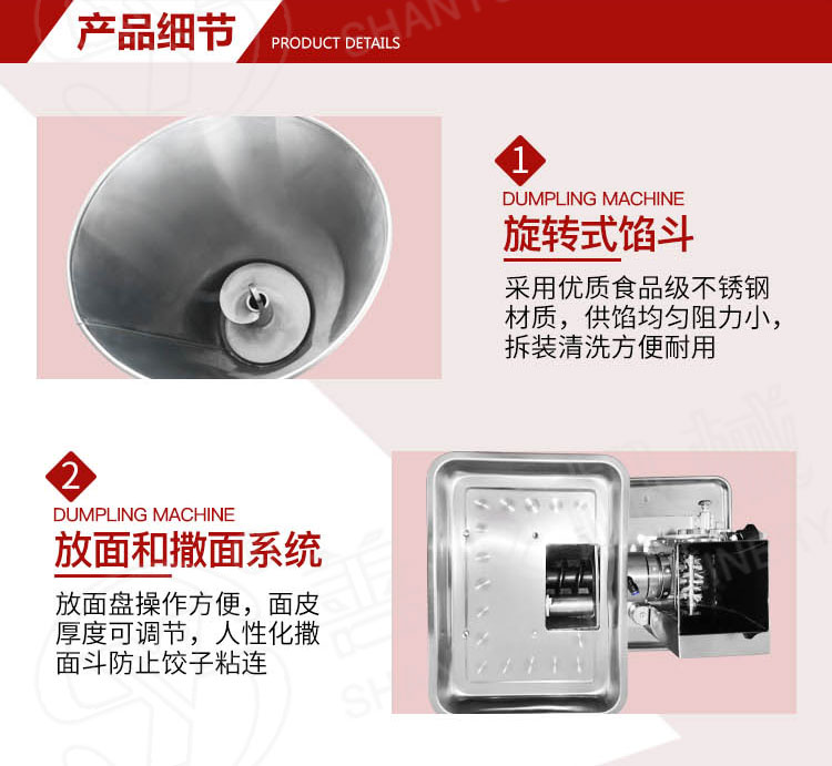 1. 一机多用途:只要更换模具,就可以制造不同的食品:春卷、馄饨、火锅水饺、珍珠水饺、咖喱饺子、花边饺子、锅帖饺子。